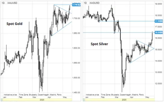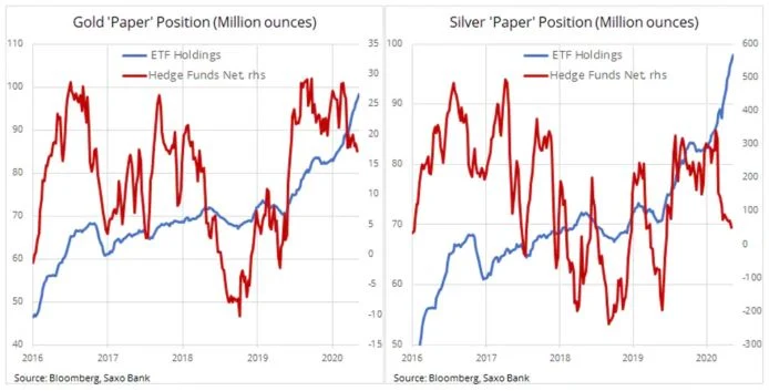 W kontekście tzw. popytu "na papierze" na metale szlachetne widać istotną rozbieżność pomiędzy firmami zajmującymi się handlem taktycznym, takimi jak większość funduszy hedgingowych, a inwestorami długoterminowymi, zarówno detalicznymi, jak i instytucjonalnymi, korzystającymi z opartych na srebrze i złocie funduszy notowanych na giełdzie. Raport Commitments of Traders za tydzień kończący się 5 maja wykazał, że fundusze hedgingowe, zaniepokojone spadkiem o niemal 40% w okresie od lutego do połowy marca, ograniczyły pozycje zwyżkowe w srebrze o 85% w porównaniu ze stanem z lutego, osiągając jedenastomiesięczne minimum. Poza niewielkim spadkiem w marcu, inwestujący w ETF od stycznia konsekwentnie kupują fundusze oparte na srebrze. Obecny ogólny wolumen w posiadaniu inwestorów osiągnął rekordowy poziom 98 mln uncji. To samo zjawisko widać na rynku złota: wolumen ETF odnotowuje kolejne rekordowe maksima, natomiast fundusze hedgingowe redukują długą pozycję w kontraktach terminowych netto do najniższego poziomu od 11 miesięcy.