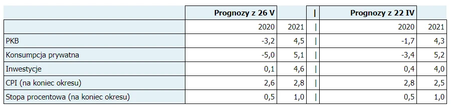 Autorzy raportu szacują, że w I-IV kw. 2020 r. PKB Polski rdr wyniesie odpowiednio: 1,6 proc., -6,1 proc., -5,0 proc. i -3,3 proc.
