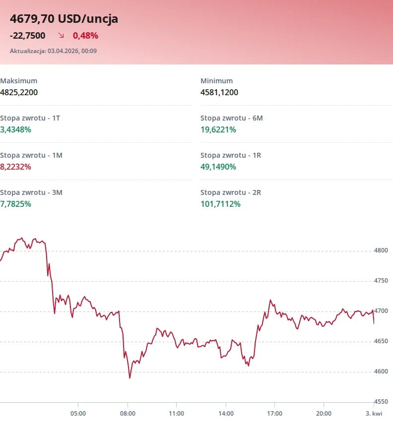 Z drugiej strony, Goldman Sachs nie wyklucza wariantu spadku ceny złota w krótkim terminie. W pesymistycznym scenariuszu, jeśli szok energetyczny związany z sytuacją geopolityczną pogłębi się, notowania uncji mogą osunąć się nawet do 3800 dolarów.