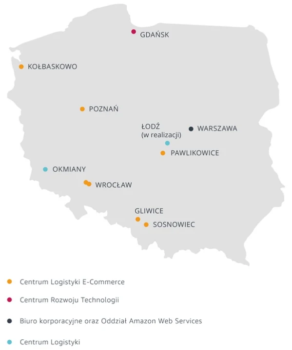 Amazon działa w Polsce od 2014 r. Teraz firma ma osiem centrów logistyki e-commerce - w Sadach koło Poznania, Sosnowcu, Kołbaskowie koło Szczecina, Bielanach Wrocławskich (dwa obiekty), Pawlikowicach koło Łodzi i Okmianach koło Bolesławca oraz Gliwicach, a także Centrum Rozwoju Technologii Amazon w Gdańsku i oddział Amazon Web Services w Warszawie.