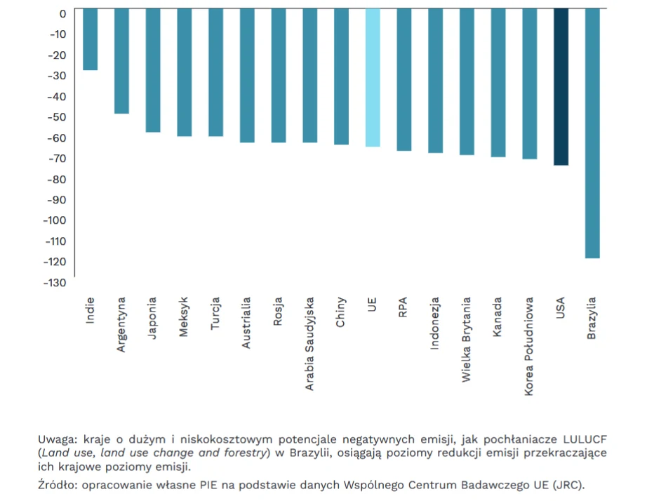 Wykres. Wymagana redukcja emisji CO2 do 2035 r. (w porównaniu do poziomu z 2022 r.) w scenariuszu ograniczenia wzrostu temperatury poniżej 1,5 st. C (w proc.)