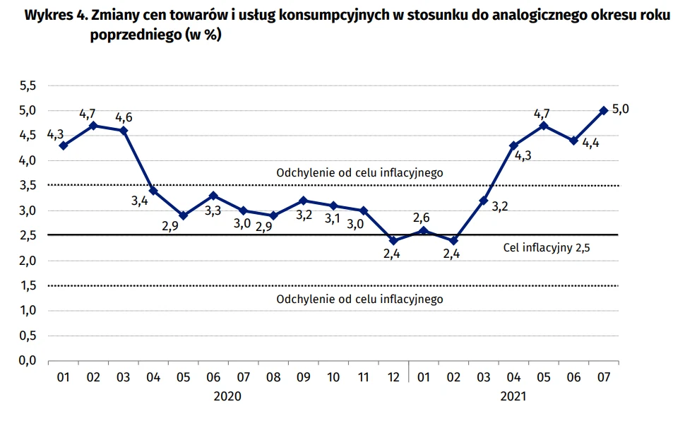 Inflacja w lipcu wyniosła licząc rok do roku 5,0 proc. - poinformował GUS. Wcześniejszy odczyt flash także wynosił 5,0 proc. Przypomnijmy: w czerwcu inflacja sięgnęła 4,4 proc.