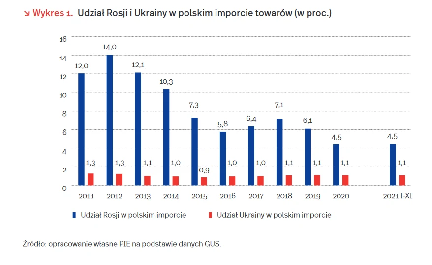 Rosyjska inwazja miałaby również negatywne konsekwencje dla polskiej gospodarki. W latach największego kryzysu związanego z wojną w Donbasie (dwuletni okres 2014-2015) polski eksport na Ukrainę spadł o 30 proc., a eksport do Rosji o 37 proc. Obecnie Ukraina jest czwartym odbiorcą polskiego eksportu poza państwami UE (2,19 proc. udziału w całości eksportu). W pierwszych 11 miesiącach 2021 r. eksport wzrósł o 25 proc. w stosunku do analogicznego okresu przed pandemią (2019 r.).