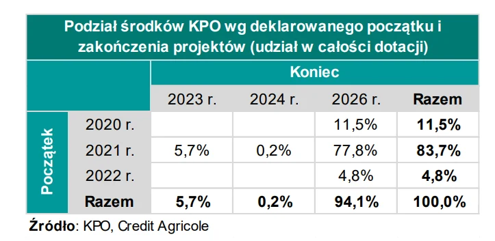 Dominująca większość projektów w KPO (w kwocie 18 mld EUR, 78 proc. dotacji) będzie bowiem trwać od 2021 r. do 2026 r., a w przypadku 94 proc. dotacji jako data zakończenia przedsięwzięcia podany jest 2026 r. Większość projektów charakteryzuje się zatem bardzo długim okresem wydatkowania pieniędzy. Ponadto, na podstawie opisu inwestycji, w większości przypadków nie można wywnioskować w jakim tempie środki będą wydatkowane, bowiem kamienie milowe często dotyczą celu dopiero na 2026 r.