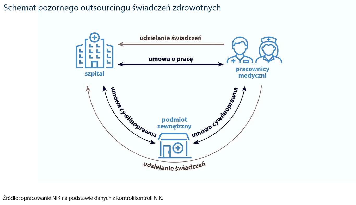 Jak tłumaczy NIK, pozorny outsourcing świadczeń zdrowotnych to sytuacja, w której podmiot leczniczy z podmiotem zewnętrznym zawiera umowę cywilnoprawną na realizację świadczeń w tymże szpitalu, przez jego własnych, etatowych pracowników. Lekarze, pielęgniarki czy ratownicy realizują te świadczenia dodatkowo, poza godzinami pracy etatowej. Odbywa się to pod bezpośrednim nadzorem kierownictwa tych szpitali, w godzinach określanych przez kierownictwo szpitali i za pomocą sprzętu, leków i innych materiałów należących do szpitali. Do tego praca wykonywana w ramach umów outsourcingowych jest rodzajowo tożsama z tą wykonywaną w ramach stosunku pracy.