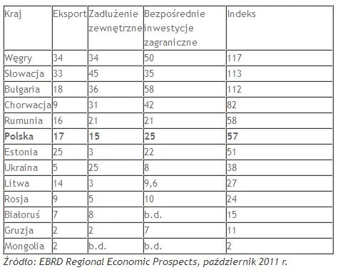 Na miejsce Polski w tej tabeli, według EBOiR wpływa stosunkowo niewielkie zadłużenie zewnętrzne i znacznie mniejsze, niż w przypadku innych krajów, uzależnienie PKB od eksportu. Na jej sytuacji natomiast - stwierdza ten bank - odbiła się repatriacja kapitału ze strony zagranicznych inwestorów portfelowych.