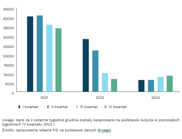 Tymczasem w porównaniu z IV kwartałem 2022 r. unijny import gazu z Rosji w 2023 r. pozostał na podobnym poziomie wahając się od 6 mld m sześc. do 8,5 mld m sześc. w zależności od kwartału.