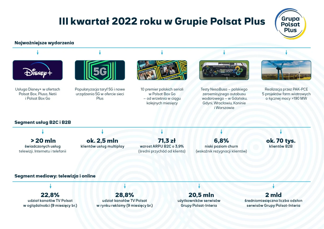 - Nasza Grupa konsekwentnie rozwija skalę swojego biznesu w dotychczasowych i nowych obszarach, niezależnie od bieżących wyzwań makroekonomicznych. Realizując strategię multiplay, klientom Polsat Box, Plusa, Netii i Polsat Box Go zapewniliśmy oferty z Disney+. Nieprzerwanie inwestujemy w naszą ofertę programową, w tym najlepszy sport, nowe seriale oraz atrakcyjną ramówkę, rozwijamy też ofertę 5G - mówi Mirosław Błaszczyk, prezes Cyfrowego Polsatu i Polkomtela, Grupa Polsat Plus. - Jednocześnie dynamicznie rozwijamy segment Czystej Energii, odpowiadając na potrzeby naszych klientów, którzy potrzebują czystej i taniej energii elektrycznej jak nigdy dotąd. To obok telewizji, telefonu i dostępu do Internetu usługa absolutnie niezbędna w każdym domu, a nasza Grupa wkrótce zaoferuje ją mieszkańcom Polski - dodaje.