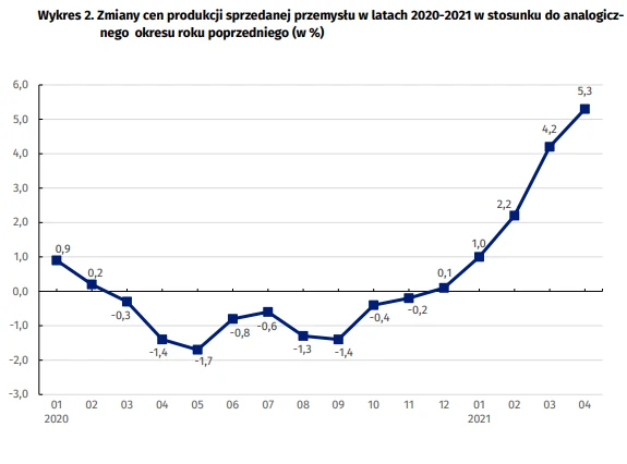 Według wstępnych danych, ceny produkcji sprzedanej przemysłu w kwietniu 2021 r. były o 0,5 proc. wyższe niż w marcu 2021 r. Podniesiono ceny we wszystkich sekcjach przemysłu. Największy wzrost cen odnotowano w sekcji przetwórstwo przemysłowe - o 0,6 proc., przy różnokierunkowych zmianach cen w poszczególnych działach. Ceny produkcji metali wzrosły o 2,1 proc.