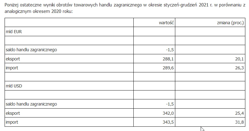 Ujemne saldo ukształtowało się na poziomie 1,5 mld USD, w analogicznym okresie 2020 r. było dodatnie i wyniosło 12,0 mld USD. Eksport wyrażony w euro wyniósł 288,1 mld EUR, a import 289,6 mld EUR (wzrósł odpowiednio w eksporcie o 20,1 proc., a w imporcie o 26,3 proc.). Ujemne saldo wyniosło 1,5 mld EUR, podczas gdy w 2020 r. było dodatnie i wyniosło 10,5 mld EUR.
