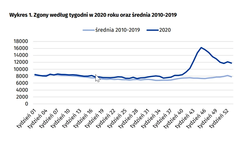 Główną przyczyną wzrostu liczby zgonów w Polsce w 2020 roku była w pandemia SARS-CoV-2, której szczyt zakażeń przypadł na ostatnie miesiące roku.