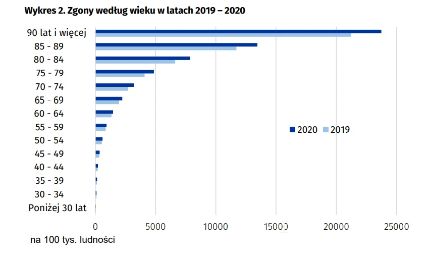 Analiza danych o zgonach w latach 2019 i 2020 według struktury wieku wskazuje wzrost niemal we wszystkich grupach wieku. Największe zwyżki - blisko 20 proc. - odnotowano wśród osób najstarszych, w grupie 70-84 lata. Współczynniki zgonów dla mężczyzn są wyższe niż dla kobiet.