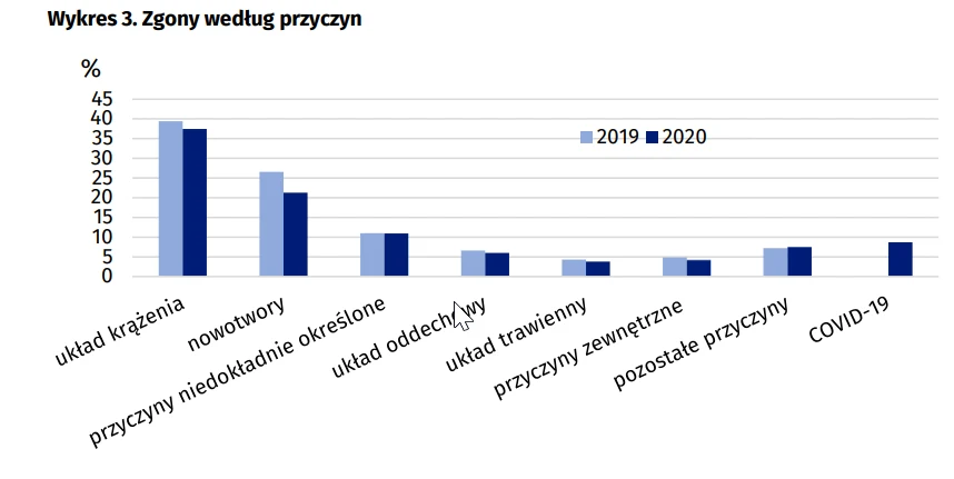 Tym samym wśród danych o zgonach według przyczyn za 2020 rok pojawiła się nowa kategoria - kod z rozdziału XXII Kody do celów specjalnych, tj. COVID-19.