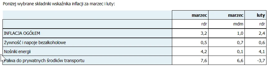 Jego zdaniem wzrost inflacji jest efektem rosnących cen paliw (+7,6 proc. rdr w marcu wobec -3,7 proc. rdr w lutym) i przyspieszenia inflacji bazowej.