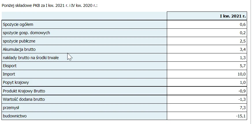 "Pierwszy kwartał 2021 r. przyniósł pierwszy wzrost popytu krajowego w ujęciu rocznym od roku. Przyczynił się do tego spodziewany niewielki wzrost spożycia gospodarstw domowych (+0,2 proc. r/r) jak też zaskakująco szybka poprawa w zakresie inwestycji (+1,3 proc. r/r). Spożycie publiczne wzrosło o 2,5 proc. r/r." - napisano w komentarzu Banku Pekao do danych GUS.