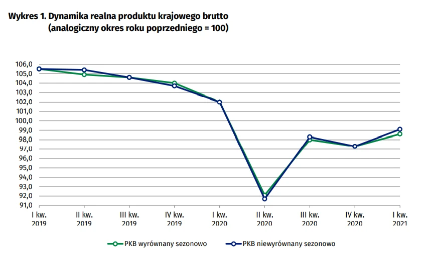 Według szybkiego szacunku GUS, PKB niewyrównany sezonowo w I kwartale 2021 roku zmniejszył się realnie o 1,2 proc. rok do roku, wobec wzrostu o 2 proc. w analogicznym okresie 2020 r. Z kolei PKB wyrównany sezonowo (w cenach stałych przy roku odniesienia 2015) w I kwartale wzrósł realnie o 0,9 proc. w porównaniu z poprzednim kwartałem i był niższy niż przed rokiem o 1,7 proc.