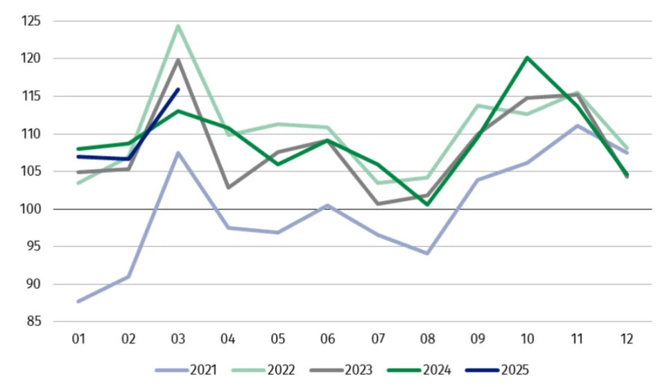 W marcu br. produkcja sprzedana przemysłu była o 2,5 proc. wyższa niż przed rokiem (wtedy notowano spadek o 5,6 proc.), a w porównaniu z lutym br. wzrosła o 8,6 proc.. W okresie styczeń-marzec br. produkcja sprzedana przemysłu była o 0,9 proc. wyższa niż w analogicznym okresie 2024 r. (wówczas notowano spadek o 0,6 proc.).
