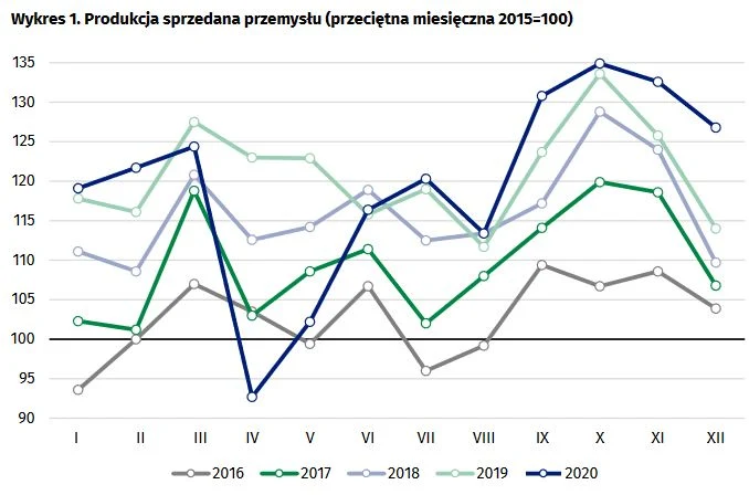 Ich zdaniem, rajdowi przemysłu w górę po dołku w II kwartale 2020 r. sprzyja utrzymująca się dobra koniunktura w Azji i relatywnie dobra sytuacja przemysły w Niemczech. Produkcji w Polsce sprzyja także przesunięcie popytu z niedostępnych usług na dobra trwałego użytku. W grudniu dodatkowo zadziałał efekt niskiej bazy z grudnia 2019 r. i korzystny układ dni roboczych.