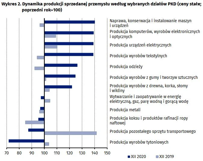 W zeszłym miesiącu w porównaniu z grudniem 2019 roku najsilniejszy, sięgający 39,3 proc. ruch w górę miał miejsce w przypadku produkcji komputerów i wyrobów elektronicznych. O 39,1. proc. zwiększyła się produkcja urządzeń elektrycznych, o 20,4 proc. mebli, a o 14 proc papieru i wyrobów z niego.