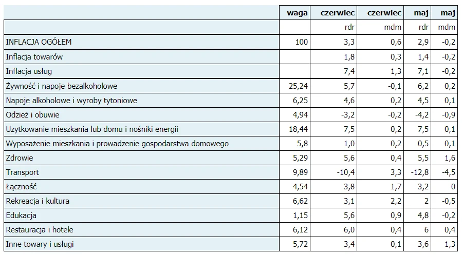 Wcześniej w szacunku flash GUS podawał, że w czerwcu ceny rok do roku wzrosły o 3,3 proc., a miesiąc do miesiaca wzrosły o 0,7 proc.Poniżej poszczególne składniki wskaźnika inflacji za czerwiec i maj 2020 r.: