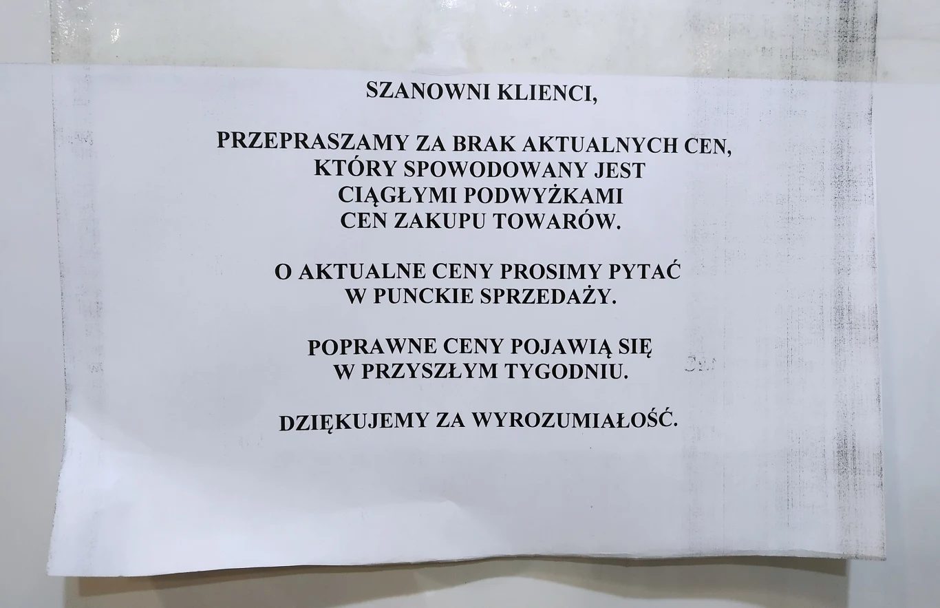 Ceny rosną na tyle szybko, że w niektórych sklepach rezygnuje się z ich podawania. W jednym z warszawskich punktów z akcesoriami do mebli przy wystawie artykułów widnieje kartka: "Przepraszamy za brak aktualnych cen, który spowodowany jest ciągłymi podwyżkami cen zakupu towarów. O aktualne ceny prosimy pytać w punkcie sprzedaży".