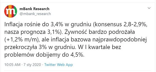 - Żywność bardzo podrożała (+1,2 proc. m/m), ale inflacja bazowa najprawdopodobniej przekroczyła 3 proc. w grudniu. W I kwartale bez problemów dobijemy do 4,5 proc. - napisali w komentarzu ekonomiści mBanku.