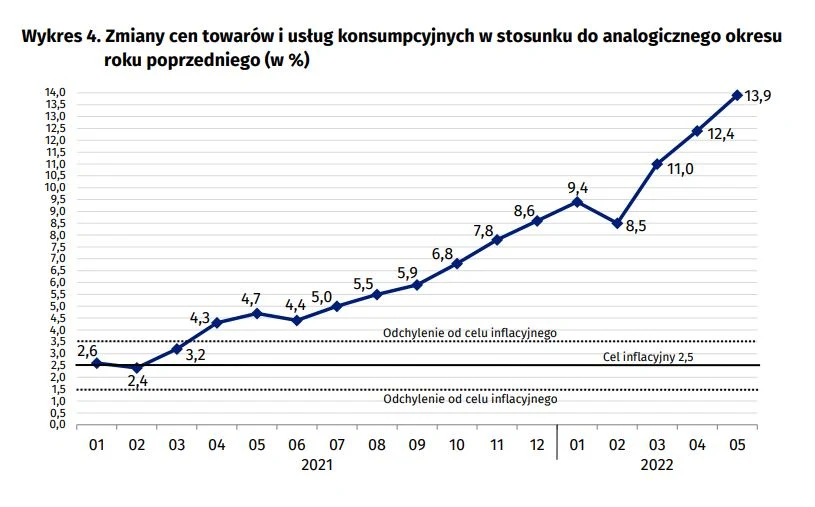 - Kolejne miesiące to dalszy wzrost wskaźnika: do 5 proc. w lipcu 2021 r., 8,6 proc. w grudniu, 11 proc. w marcu. Dzisiaj inflacja wynosi już 13,9 proc.