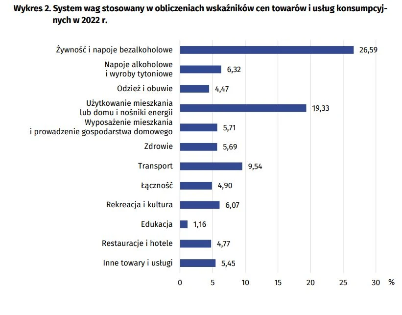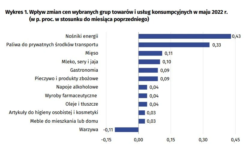 W maju 2022 r. w porównaniu z poprzednim miesiącem największy wpływ na wskaźnik cen towarów i usług konsumpcyjnych ogółem miały wyższe ceny w zakresie mieszkania (o 2,3 proc.), transportu (o 3,4 proc.), żywności (o 1,3 proc.) oraz restauracji i hoteli (o 2,4 proc.), które podwyższyły wskaźnik odpowiednio o 0,58 p. proc., 0,35 p. proc., 0,33 p. proc. i 0,11 p. proc.