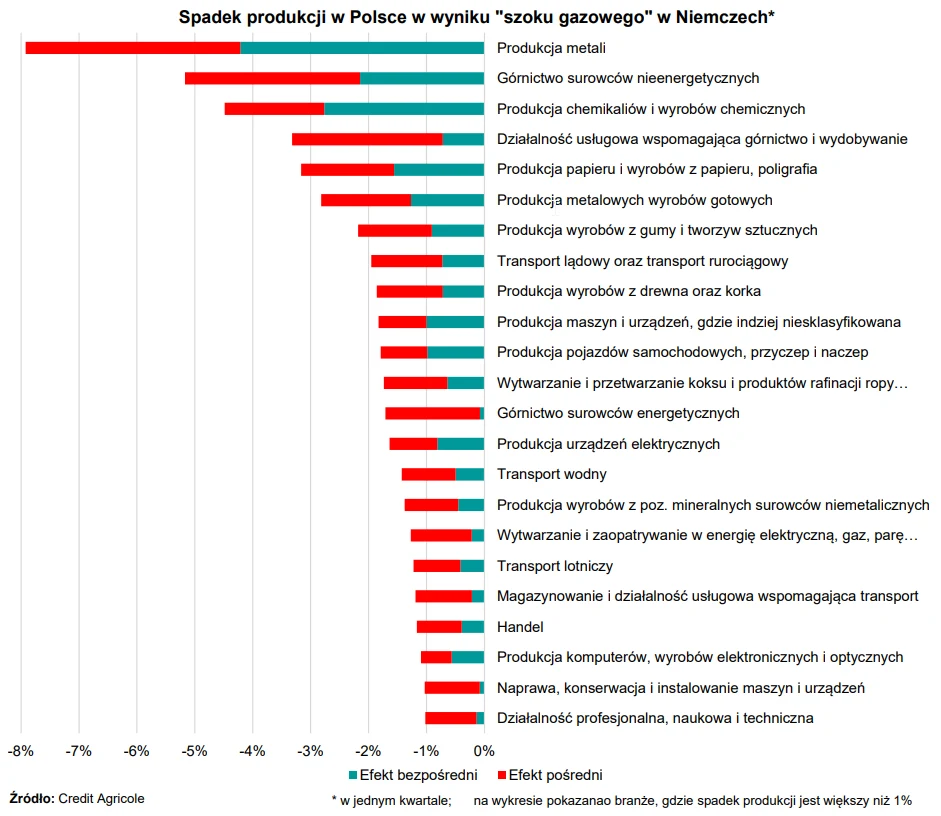 Relatywna skala efektów bezpośrednich i pośrednich jest mocno zróżnicowana w zależności od branży. W niektórych dominują efekty bezpośrednie - przykładowo produkcja chemikaliów i wyrobów chemicznych posiada dużą ekspozycję na niemieckie branże, które zostaną mocno dotknięte przez zakłócenia w dostawach gazu. Z kolei efekty pośrednie dominują w przypadku "Wytwarzania i zaopatrywania w energię elektryczną, gaz, parę wodną, gorącą wodę". Spadek produkcji w Niemczech bezpośrednio ma niewielki wpływ na aktywność w tej branży. Jednak z uwagi na spadek produkcji w innych kategoriach polskiego przetwórstwa, w tej branży również odnotowany zostanie spadek aktywności z uwagi na zmniejszone zapotrzebowanie na energię. Nasza analiza wskazuje, że łącznie w ramach efektów bezpośrednich i pośrednich "szok gazowy" w Niemczech przyczyniłby się do znaczącego spadku produkcji w Polsce w ramach kategorii takich jak "produkcja metali" (o 7,9 proc.), "górnictwo surowców nieenergetycznych" (o 5,2 proc.), "produkcja chemikaliów i wyrobów chemicznych" (4,5 proc.), "działalność usługowa wspomagająca górnictwo i wydobywanie" (3,3 proc.) oraz "produkcja papieru i wyrobów z papieru" (3,2 proc.).