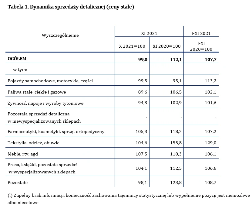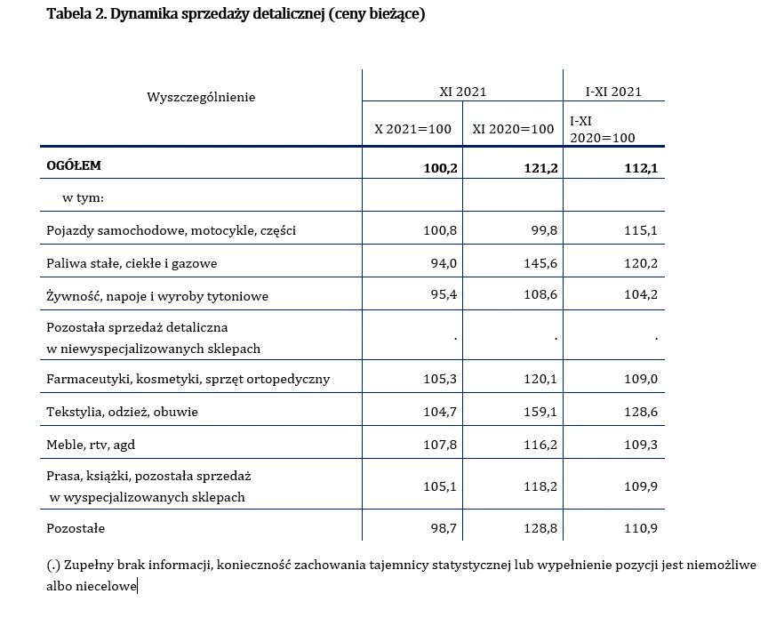Wzrost sprzedaży detalicznej przyśpieszył w listopadzie z 6,9 do 12,1 proc., zauważalnie powyżej rynkowych prognoz (8,7 proc.). Komentarz GUS wskazuje, że najszybciej rósł wolumen w handlu odzieżą oraz dobrami półtrwałymi np. biżuterią, zabawkami czy w drogeriach. Wynik osłabiały niskie obroty dealerów samochodowych - niedobór półprzewodników oraz wstrzymanie produkcji przez koncerny samochodowe utrwali taki stan w kolejnych miesiącach.