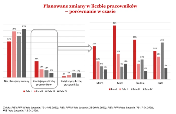 W porównaniu do deklaracji z końca kwietnia, odsetek przedsiębiorstw planujących redukcję zatrudnienia spadł o 4 pkt. proc., zaś w porównaniu do deklaracji z końca marca - o 20 pkt. proc.