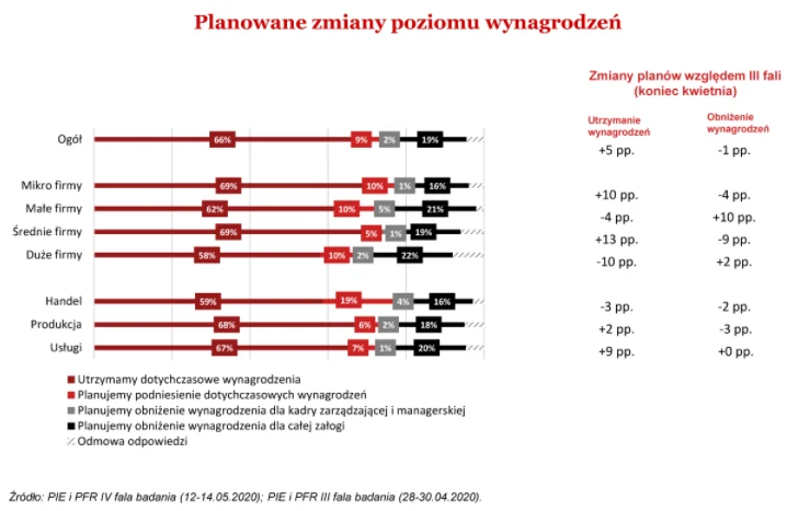 - Wejście w etap odmrażania gospodarki zmienia sytuację na rynku pracy. Po dotychczasowym wyraźnym zahamowaniu zaczynamy obserwować systematyczny spadek odsetka firm planujących redukcję poziomu zatrudnienia. W końcu marca takich przedsiębiorstw było 28 proc., teraz jest ich 8 proc. Równie istotną kwestią jest ograniczona skłonność pracodawców do obniżania wynagrodzeń. 66 proc. planuje bowiem utrzymanie ich obecnego poziomu. To wynik o 30 pkt. proc. wyższy niż pod koniec marca. Niestety wśród małych firm ten odsetek wzrósł o 10 pkt proc, co może świadczyć o rosnących różnicach w odporności na kryzys - twierdzi Andrzej Kubisiak, zastępca dyrektora PIE ds. badań i analiz.