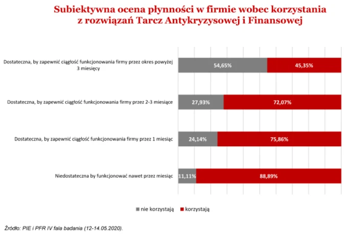 - Wytrzymałość w warunkach kryzysowych mniejszych podmiotów jest ograniczona i to się potwierdza. Istotną rolę w ratowaniu będących w najtrudniejszym położeniu odgrywa wsparcie w ramach tarcz antykryzysowej i finansowej. W badaniach ujawnił się fakt, że aż 89 proc. firm oceniających swoje zasoby finansowe jako niedostateczne by funkcjonować choćby miesiąc, skorzystało z rządowego wsparcia. Wśród firm zdolnych przetrwać przez miesiąc wskaźnik korzystających wynosi niemal 76 proc., zaś wśród zdolnych do funkcjonowania dłużej niż kwartał nieco ponad 45 proc. Nasze badania pokazują, że wsparcie finansowe w czasach kryzysu najchętniej jest podejmowane w grupach firm o najmniejszych zapasach finansowych. To dobry sygnał, bo pokazuje, że pieniądze na ratowanie polskiej gospodarki są wycelowane tam, gdzie znajdują się największe potrzeby - mówi Piotr Arak, dyrektor Polskiego Instytutu Ekonomicznego.