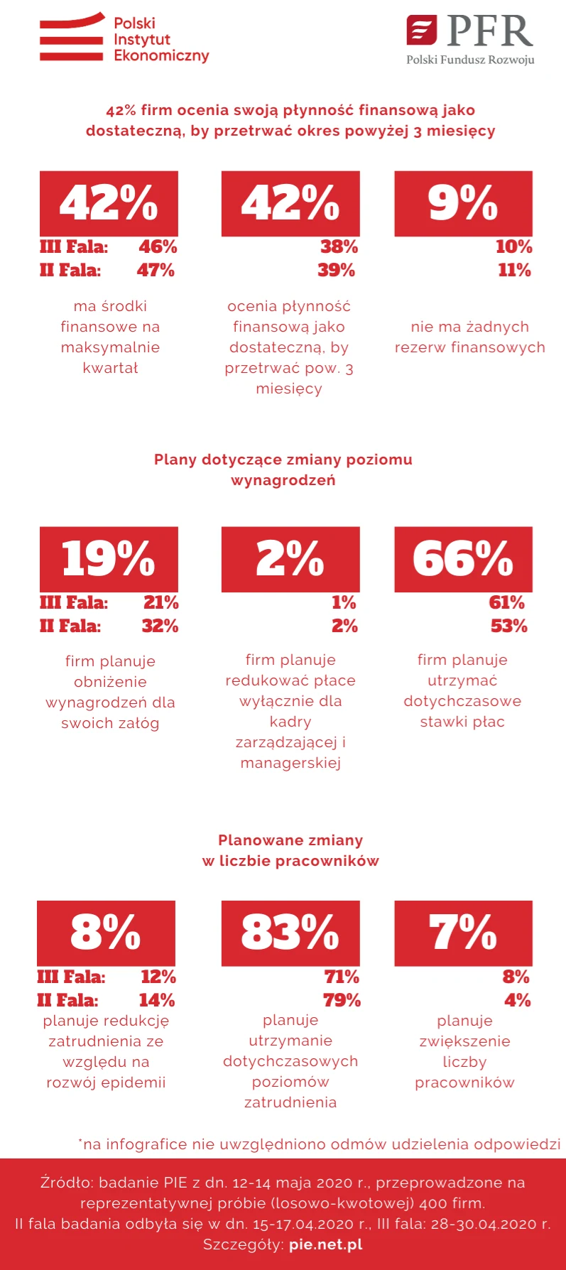 Badanie Polskiego Instytutu Ekonomicznego oraz Polskiego Funduszu Rozwoju przeprowadzone przez IBRiS w dniach 12-14 maja 2020 r. wśród właścicieli firm lub osób decyzyjnych w przedsiębiorstwach na temat ich sytuacji i planów po nastaniu w Polsce epidemii koronawirusa. Badanie przeprowadzono za pomocą wspomaganych komputerowo wywiadów telefonicznych (CATI) na próbie losowo-kwotowej obejmującej 405 firm, w 4 kategoriach wielkości i 3 sektorach branżowych. Na podstawie tej próby możemy przeprowadzić wnioskowanie o populacji polskich przedsiębiorstw przy poziomie ufności 0,95, a błąd szacunku wskaźników struktury wyniesie 5 proc.