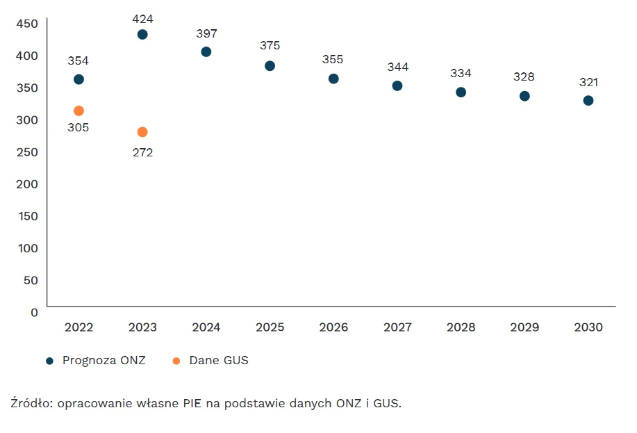 PIE zwraca nawet uwagę, że ostatnia prognoza demograficzna ONZ dokonuje istotnej rewizji swoich poprzednich przewidywań. W 2017 r., (globalny wskaźnik dzietności wynosił wtedy 2,5), przewidywano, że spadnie on do 2,4 do końca trzeciej dekady tego stulecia. Jednak już w 2021 r. wyniósł 2,3. Dość jasno pokazuje to choćby prognozowana i faktyczna liczba urodzeń w Polsce (wykres poniżej).