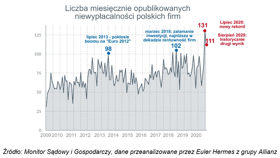 W lipcu i w sierpniu odnotowano z kolei dwa najwyższe odczyty liczby niewypłacalności - odpowiednio 131 i 111.