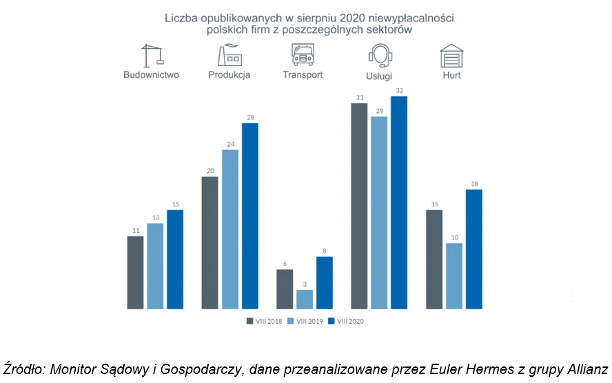 W okresie marzec - maj liczba niewypłacalności, pomimo zamknięcia dużej części gospodarki, spadku zamówień i sprzedaży w kraju i za granicą, była mniejsza niż przed rokiem. Głównie z przyczyn formalnych oraz - co również było bardzo istotne - publicznych programów wsparcia przedsiębiorstw. Do firm trafiło wówczas bezpośrednio kilkadziesiąt miliardów złotych na ich konta, plus wsparcie w postaci gwarancji BGK oraz zwolnień i odroczeń ZUS, podatkowych, na utrzymanie miejsc pracy etc. Niestety, po chwilowym zastoju w trakcie lockdownu skala niewypłacalności powróciła ze zdwojoną siłą. - Środki pomocowe nie były w stanie pokryć wszystkich kosztów stałych, zobowiązań np. kredytowych czy leasingowych - stąd mimo wszystko wiele firm kwalifikowało się do ogłoszenia niewypłacalności czy działań restrukturyzacyjnych, chociażby z powodu braku perspektyw na poprawę w najbliższym czasie - ocenia Tomasz Starus, członek Zarządu Euler Hermes odpowiedzialny za ocenę ryzyka. - Odbicie popytu konsumenckiego nie jest stałe, w niektórych branżach jedynie rekompensujące odłożone zakupy - spada dynamika popytu w kraju i za granicą, co przekłada się m.in. na wyniki przemysłu i sektora usług.