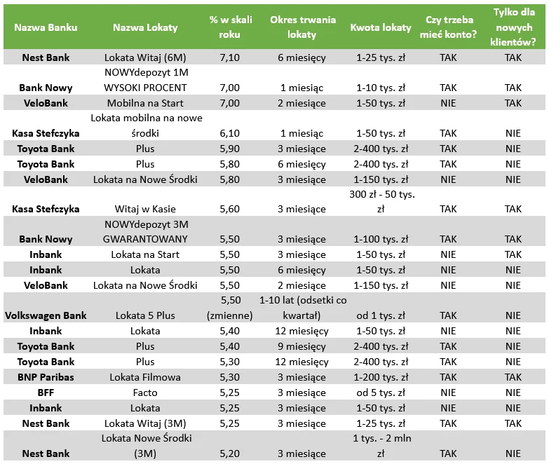 Spośród lokat, do założenia których wystarczy mieć podstawowy rachunek bankowy - a w kilku przypadkach nawet on nie jest konieczny - najlepsze oprocentowanie oferują trzy lokaty powitalne. Są one przeznaczone tylko dla nowych klientów. Najwyżej oprocentowana lokata, którą mogą założyć także dotychczasowi klienci banku, to Lokata Mobilna na nowe środki w Kasie Stefczyka na 1 miesiąc.