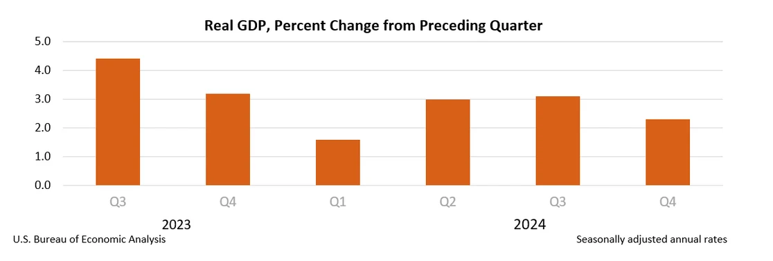 Gospodarka USA staje w obliczu spodziewanego osłabienia wzrostu. Przypomnijmy: jak wynika z opublikowanych w końcu lutego danych Biura Analiz Ekonomicznych USA (BEA) realny produkt krajowy brutto (PKB) rósł w czwartym kwartale 2024 r. (październik, listopad i grudzień) w tempie 2,3 proc. rocznie. Komentatorzy zauważyli, że jeśli wynik ten zostanie potwierdzony, będzie to jeden z najsłabszych kwartałów ostatnich dwóch lat.
