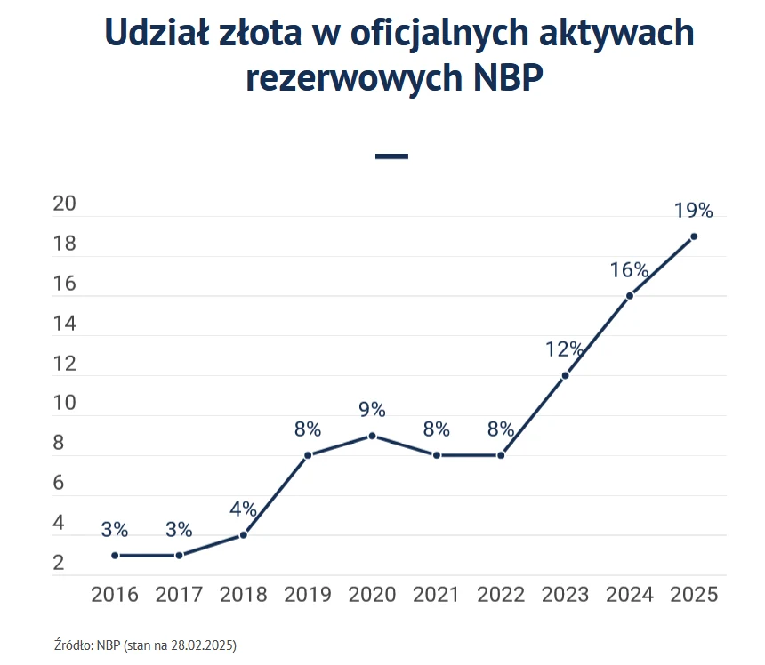 W 2024 r. NBP kupił ponad 89,5 tony złota. Jego udział w rezerwach na koniec grudnia wynosił 16,9 proc. i wciąż rośnie. Bank centralny ma w planach zwiększenie udziału kruszcu do 20 proc. całości rezerw walutowych. Ma to nastąpić w 2025 roku.