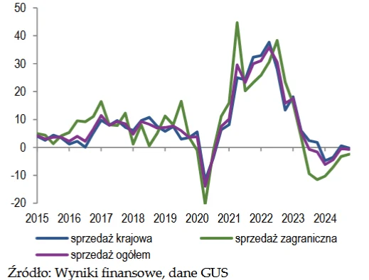 W IV kw. 2024 r. przychody ze sprzedaży przedsiębiorstw nadal obniżały się w ujęciu rocznym, a skala tego spadku była nieco większa niż kwartał wcześniej (-0,7 proc. r/r wobec -0,4 proc. r/r w III kw.).