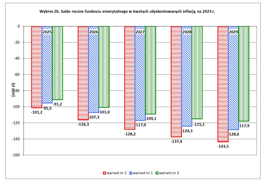 Mimo że ZUS przygotował trzy scenariusze prognozy - pośrednią, pesymistyczną i optymistyczną - w każdym z nich saldo roczne funduszu emerytalnego pozostaje ujemne.