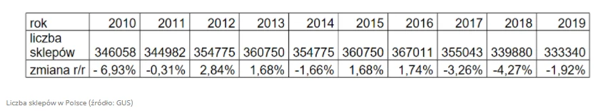 Spore różnice zauważyć można między danymi za rok 2016 a 2019. W roku 2016 działało w Polsce 367 011 sklepów, a trzy lata później było ich o 33 671 mniej. Czy należy wiązać to z wprowadzeniem w 2018 roku ograniczeń w niedzielnym handlu? Ministerstwo Rozwoju, Pracy i Technologii przekonuje, że nie.