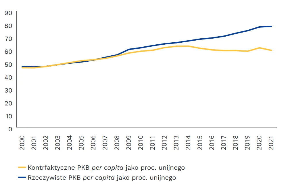 Wykres. Rzeczywiste PKB per capita Polski jako proc. PKB per capita UE (EWG przed 1993 r.) oraz scenariusz, gdyby Polska nie wstąpiła do UE (w proc.)