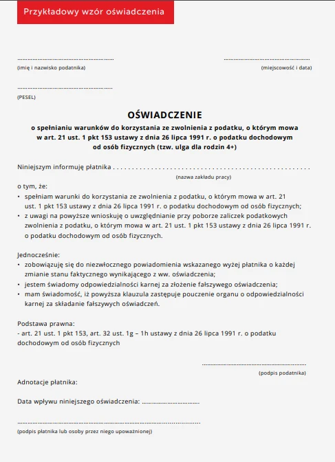 W oświadczeniu informujesz, że spełniasz warunki do zastosowania ulgi. Jednocześnie w oświadczeniu musisz zawrzeć klauzulę o treści: "Jestem świadomy/a odpowiedzialności karnej za złożenie fałszywego oświadczenia" - klauzula ta zastępuje pouczenie organu o odpowiedzialności karnej za składanie fałszywych oświadczeń. Jeżeli oświadczenie spełni wszystkie wymogi co do jego treści, pracodawca lub zleceniodawca zastosuje zwolnienie najpóźniej od następnego miesiąca po złożeniu oświadczenia.