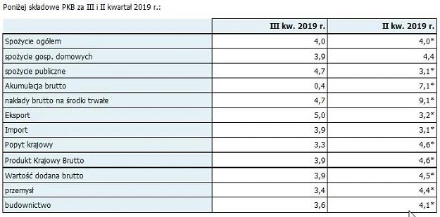 "Wolniejszy niż w poprzednim kwartale wzrost gospodarczy to przede wszystkim konsekwencja spowolnienia tempa wzrostu inwestycji z 9,1 proc. rdr w II kw. 2019 (po rewizji) do 4,7 proc. rdr w III kw. 2019. Do spowolnienia przyczynił się także negatywny wpływ zmiany stanu zapasów, który obniżył roczne tempo wzrostu PKB w III kw. 2019 r. o 0,7 pkt proc." - zwraca uwagę ekonomista Pekao.