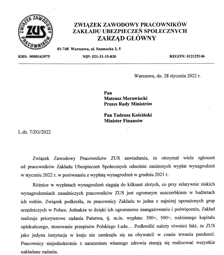 Związek Zawodowy Pracowników ZUS w liście skierowanym do premiera Mateusza Morawieckiego i ministra finansów Tadeusza Kościńskiego, który widziała Interia, podkreśla, że otrzymał wiele zgłoszeń odnośnie zaniżonych wypłat wynagrodzeń w styczniu w porównaniu z wypłatą wynagrodzeń w grudniu 2021 roku. I jak zaznaczono, różnice sięgają kilkuset złotych.