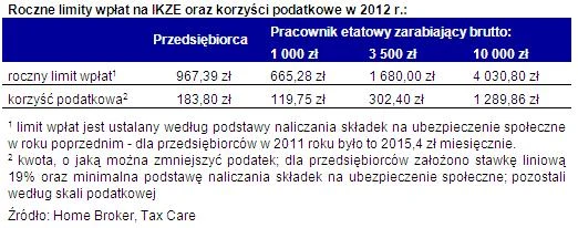 Poza tym, limity odkładania na IKZE są bardzo niskie. 4 proc. rocznej podstawy obliczania składek na ubezpieczenia społeczne, z narzuconym górnym limitem niewiele przekraczającym 4 tys. zł (który jest dostępny tylko dla najlepiej zarabiających i zatrudnionych na umowach o pracę) to bardzo niewiele. W praktyce, zarabiający przeciętnie "etatowiec" rocznie będzie mógł odłożyć niecałe 1,7 tys. zł. Natomiast przedsiębiorcy, którzy najbardziej potrzebują dodatkowych zabezpieczeń, w 2012 roku na IKZE mogą wpłacić zaledwie 960 zł rocznie. Tymczasem wszyscy przyszli emeryci, niezależnie od osiąganego przez nich dochodu, na IKE mogą odłożyć ponad 10 tys. zł (trzykrotność średniego wynagrodzenia brutto w sektorze przedsiębiorstw w poprzednim roku).