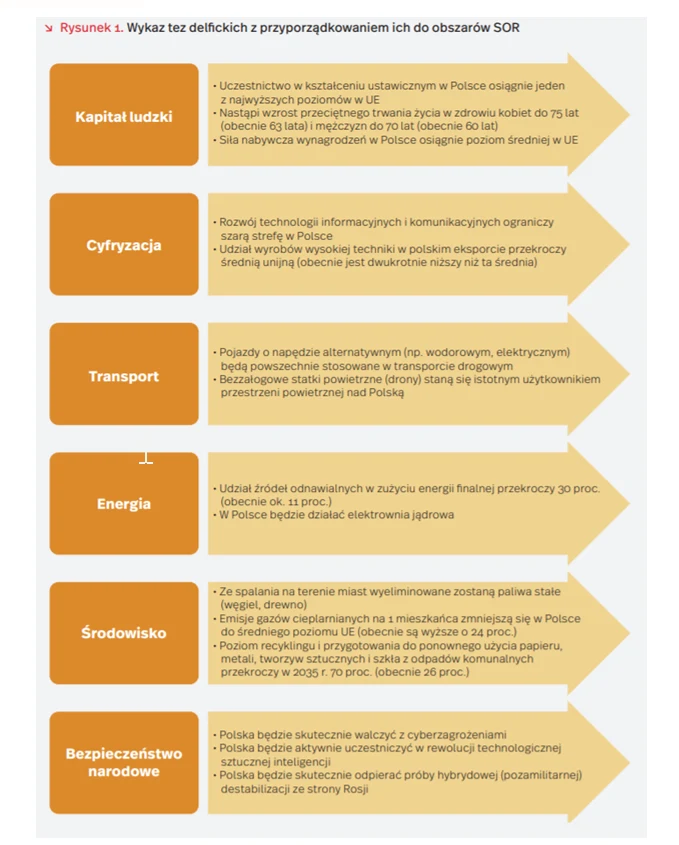 Raport Foresight Polska 2035 stanowi podsumowanie wyników badań, które zrealizowano metodą Delphi. Metodę tę wykorzystuje się do przewidywania długoterminowych procesów lub zjawisk, o których wiedza jest niewystarczająca lub niepewna. Celem badania było uchwycenie możliwości i sposobu kształtowania się w przyszłości w Polsce zjawisk związanych z kapitałem ludzkim, cyfryzacją, transportem, energią, środowiskiem, bezpieczeństwem narodowym - tłumaczy Katarzyna Dębkowska. Badanie zrealizowano w grupie ekspertów reprezentujących naukę, biznes, administrację, organizacje pozarządowe i media. Ich wiedza, doświadczenie i intuicja pozwoliły na ocenę 15 tez delfickich, czyli stwierdzeń dotyczących przyszłości.