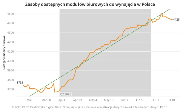 W Polsce mamy w sumie prawie 4,5 tys. wolnych biur. - Jest to wzrost o ponad 20 proc. w porównaniu z końcem marca. Rośnie również czas, w którym powierzchnie stoją puste. Według REDD Index wolne biura czekają w Polsce na najemców średnio przez 289 dni. To wzrost o 42 dni w porównaniu z początkiem kwietnia - wylicza Judyta Bartnicka.